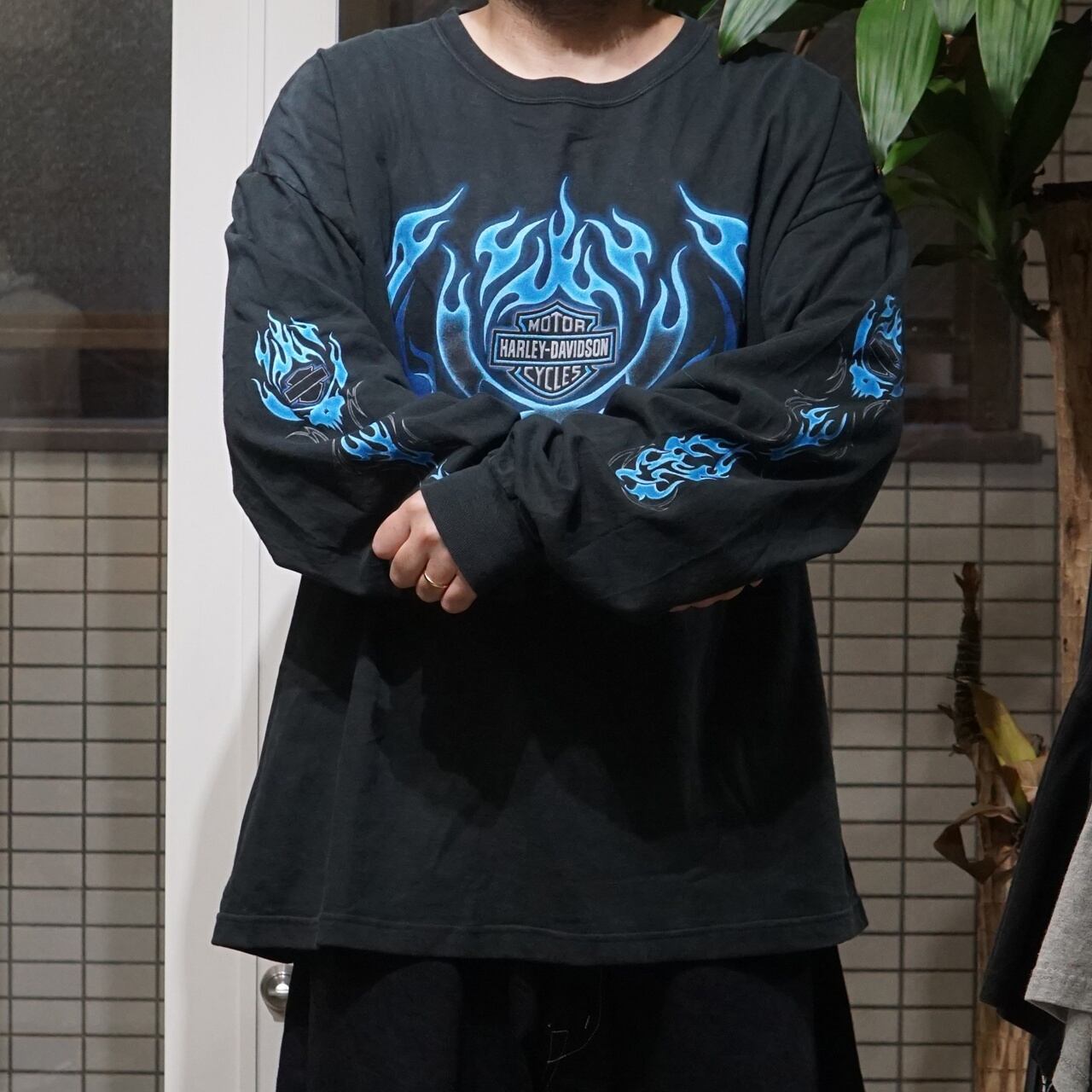 00's Vintage Harley Shirt Blue Flame L/S【XL】