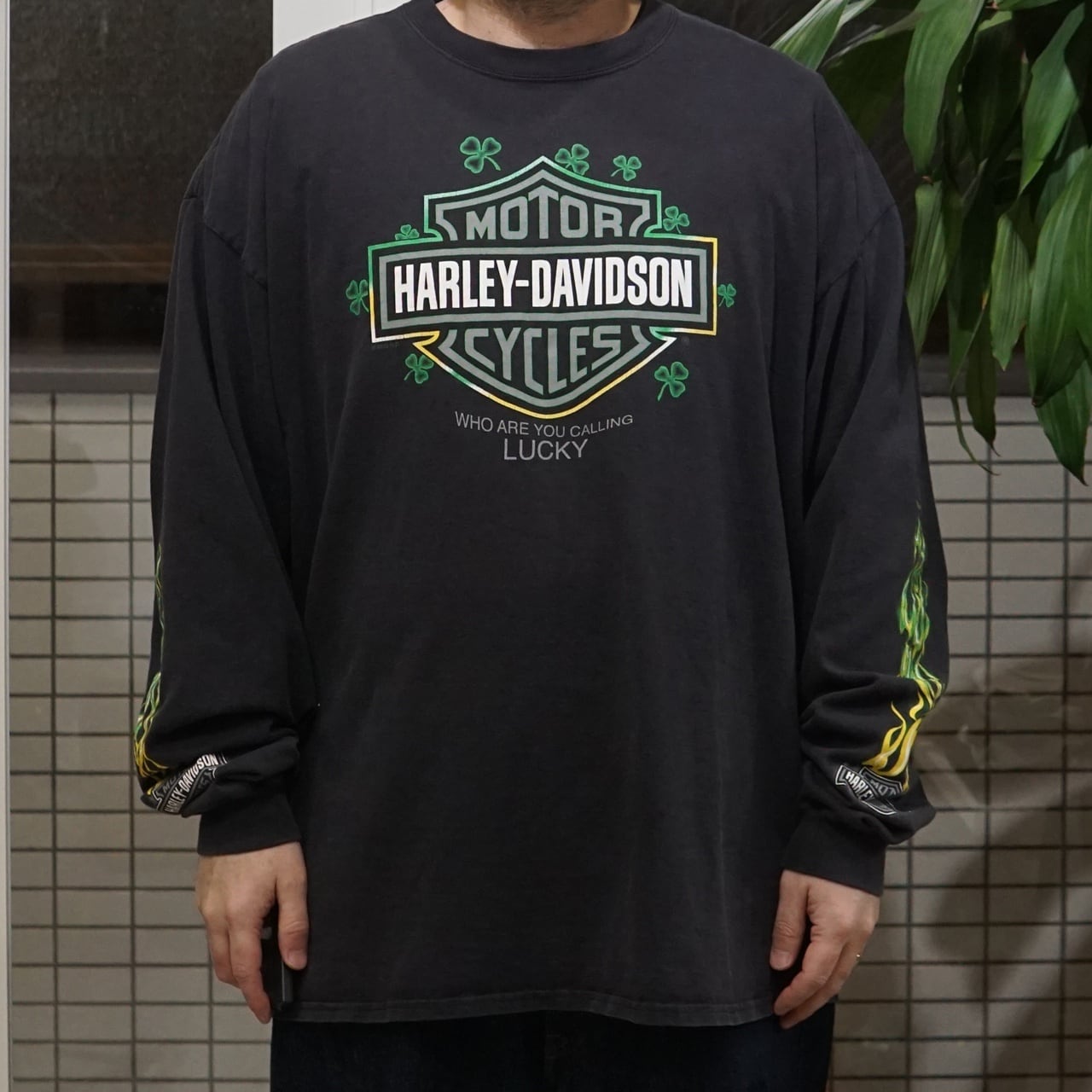 00's Vintage Harley Shirt Bar&Shield Green Flame L/S【XXL】